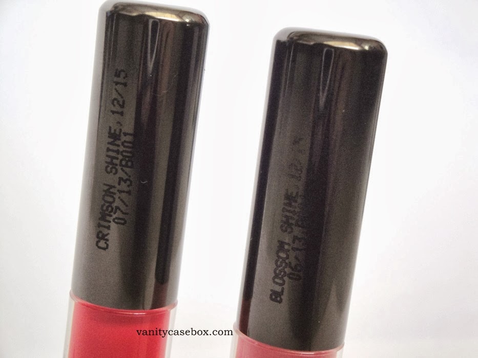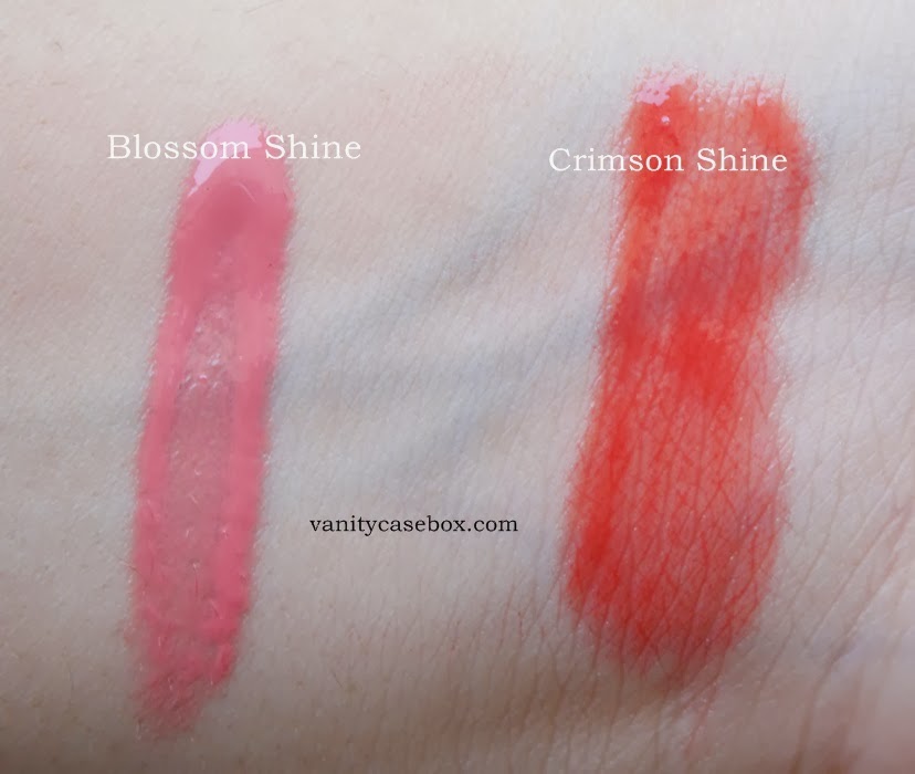 “Blossom Shine” is a very pretty muted bright pink lip gloss, that would work for pale-fair skin tones. I absolutely adore this shade! Although it may not work for skin tones with too much of yellow undertones. “Crimson Shine” is a red with a tinge of orange.