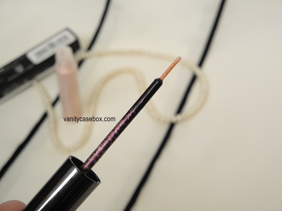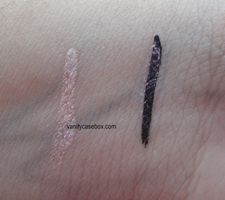 Using Vega lip liner brush, I first apply a thin line with the pink eyeshadow from “Sleek Palette”. After that, I apply two coats of the pink liner. I either draw a thin black liner upon it or wing it slightly. I don’t like layering it upon black eyeliner because I don’t like the shade then. But I have still swatched it that way for reference.
