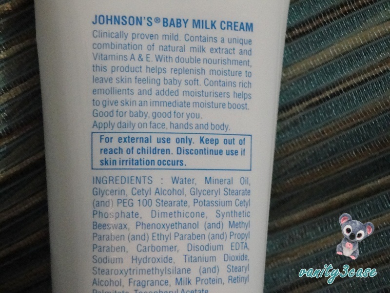 Ingredients: Water, mineral oil, glycerin, cetyl alcohol, glyceril stearate and PEG 100 Stearate, Potassium Cetyl Phosphate, Dimethicone, Synthetic Beeswax, Phenoxyethanol and Methyl Paraben and Ethyl Paraben and Propyl Paraben, Carbomer, Disodium EDTA, Sodium Hydroxide, Titanium Dioxide, Stearoxytrimethylsilane Stearyl Alcohol, fragrance, milk protein, Retinyl Palmitate, Tocopheryl Acetate.