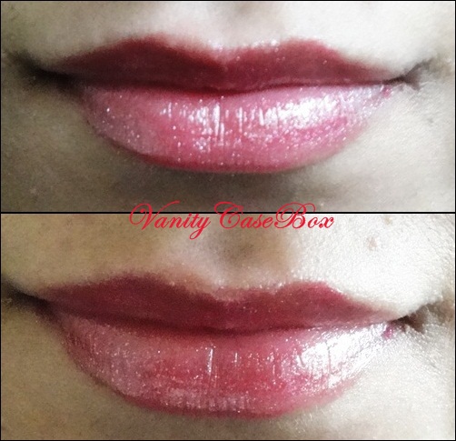 To get a full coverage of this gloss, you need to swipe it 2-3 times because with one swipe, it gives a sheer color. The texture is light weight and not so sticky. I have never experienced any uncomfortable feeling with wearing it. It also moisturizes lips decently.