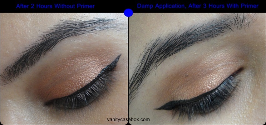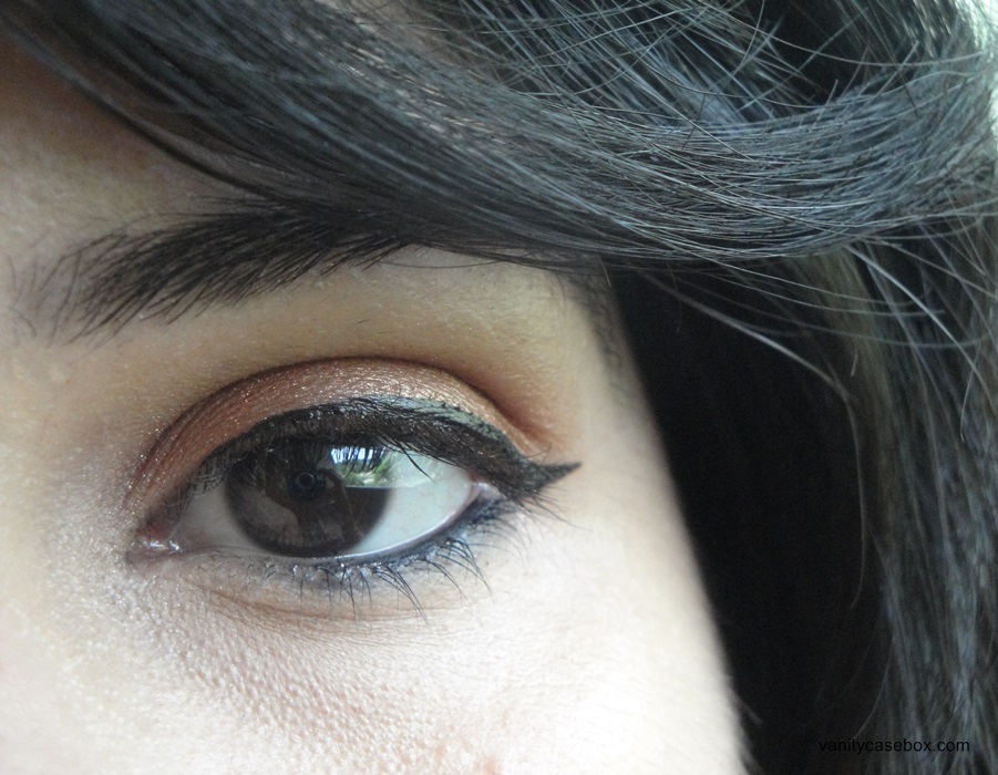 Now, moving onto the quality, the texture of the eyeshadow feels stiff and dry. The pigmentation is just average. When I applied it dry, the intensity of the shade did not coat my eyelids fully and it wore off majorly in just 2 hours. Next time, I applied it using a wet brush. The intensity came off much better on my eyelids and it lasted for around 3 hours on my eyelids. But even in those 3 hours, there was quite a creasing over my fold area. Β With a good eye primer beneath, it lasted an hour more but with considerable fading and creasing. Blending too takes a little extra effort, due to the stiff texture. For reference, I have oily eyelids.