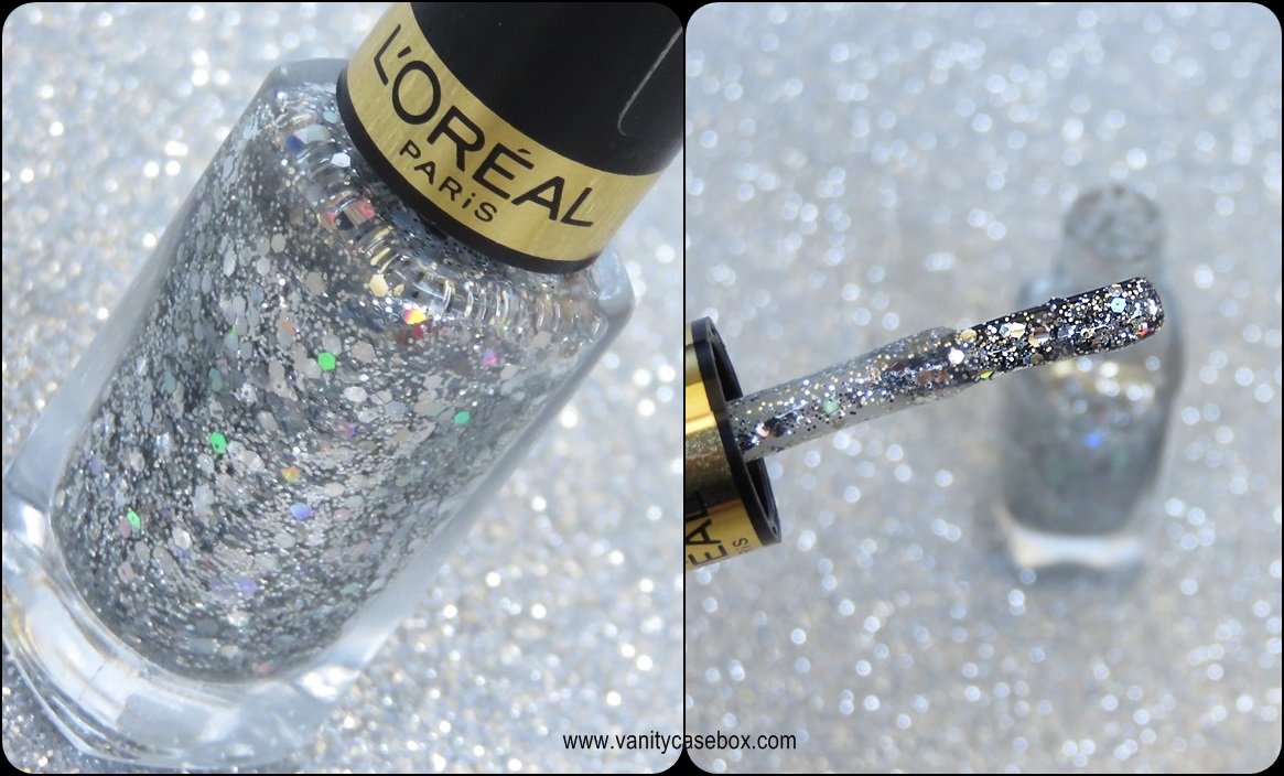 L’Oréal Paris “Disco ball” nail enamel has a transparent base with midsized hexes. The nail polish is just the right consistency, which is why it dries quickly. Plus, the glitter comes out in a decent amount in just one go. I have applied only one coat in these pictures.