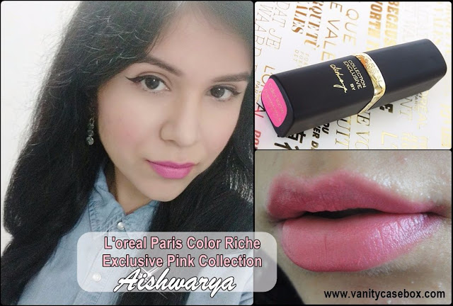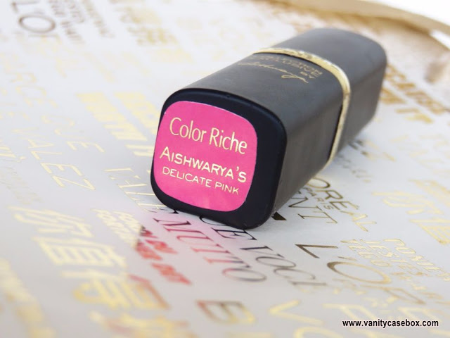 L’oreal Paris Color Riche Exclusive Pink Collection Aishwarya comes in a matte black packaging with a Golden band around the centre. The shade name is mentioned at the bottom of the lipstick. I love the sharp bullet of the lipstick as it allows me to apply at the corners perfectly.